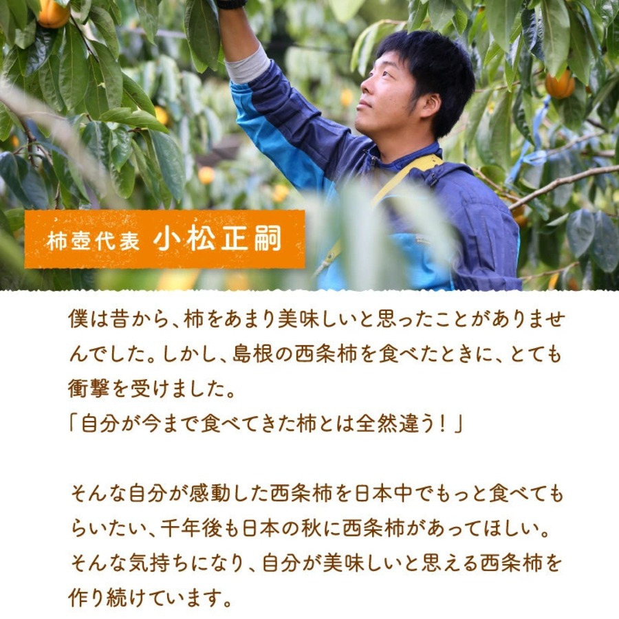 商品番号【HG08-LL】 ドライフルーツの美味しさは原料とする果実の味で決まります。野菜ソムリエサミット2012で渋柿部門の大賞に輝いた出雲の西条柿を原料として、柿農家が一つ一つ思いを込めて作ったセミドライタイプの干し柿です。柿は哀愁フルーツと呼ばていますが、こだわりの水分量で実現したしっとりとした絶妙な食感は、新たなスイーツとして若い女性にも人気あります。 干し柿が苦手!という方にもぜひ一度お召し上がりいただきたい干し柿です。 原材料名:柿(島根県産) 内容量:50g(大玉)×8個 賞味期限:製造より60日 保存方法:高温多湿、直射日光を避けて常温で保存してください (開封後は早めにお召し上がりください)